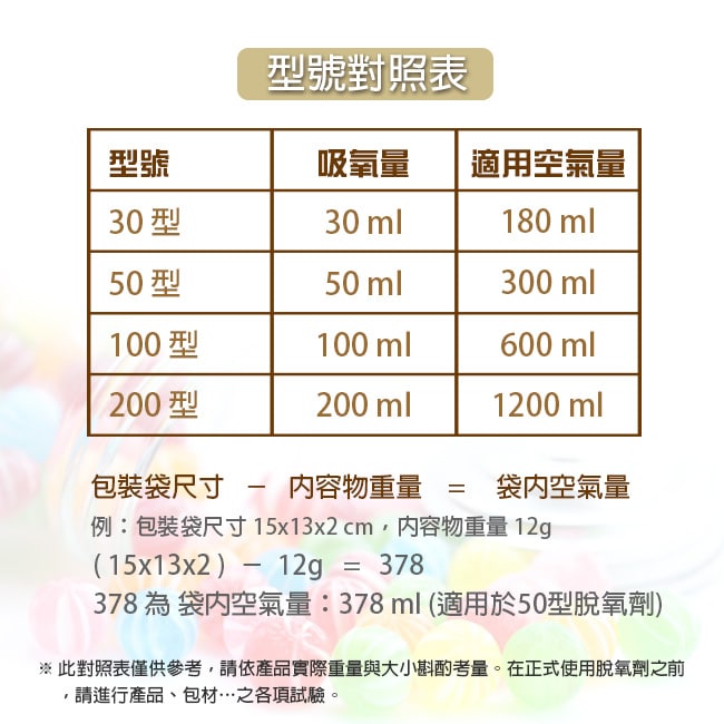 - 請根據食品種類、包裝大小等,選擇適當規格型號的脫氧劑