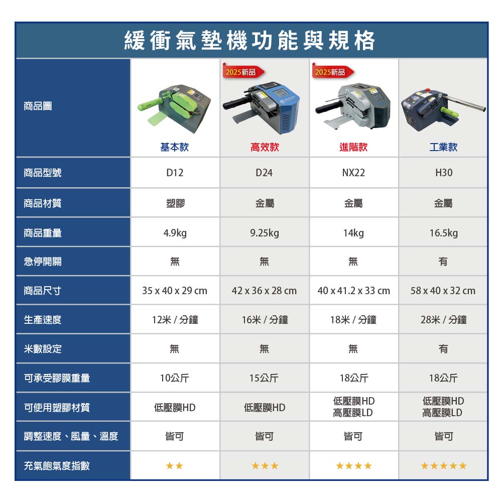 - 速度/風量:緩衝氣墊機速度與風量需調整配合,不同品種的膜參數值不相同